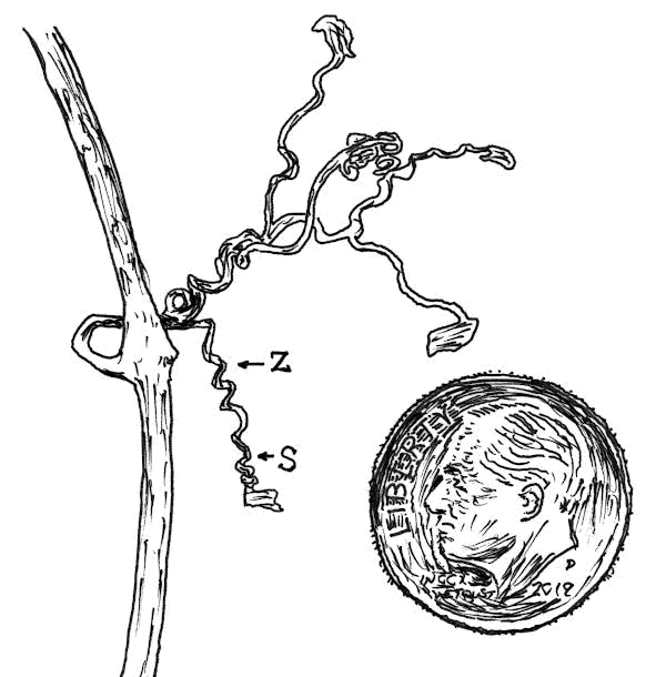 The Virginia Creeper (Parthenocissus quinquefolia) tendril in Figure 1.6 (top) has a Z twist closer to the main vine, and an S twist towards the end. The Porcelain Berry (Ampelopsis brevipedunculata) tendril on the bottom has an S twist in the left half, nearest the fingertips, and a Z twist in the right half, nearest the wrist.