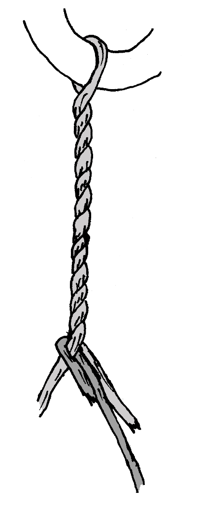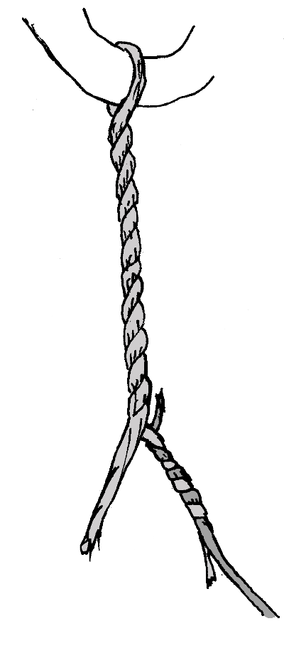 Two strand rope is easy to make; you twist one strand in each hand, both hands twisting in the same direction. Then you wrap the two strands around each other, in the opposite direction.[805] [130]