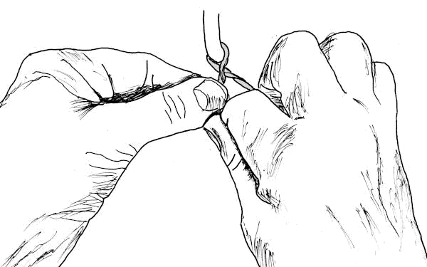 The easiest way to start twisting is by looping a wisp of fibers around a fixed object. A hook on a bench, a nail in a post, branch of a tree, a friend's finger, your big toe. Do not center your fibers on the hook, but rather make one side twice as long as the other. This lets you add more fibers on one side without creating a weakness on both strands in the same place.